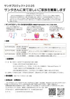 ボランティアサンタが考えた企画をベースに、ご家族から預かったプレゼントと一緒に、こどもたちに夢と一生の思い出を届けます! ■訪問場所:①中区のご自宅②中区のご自宅以外(応募者に場所をご用意いただきます。)③青少年センター、から選択OK! ■対象:①3才から小学2年生までのお子様がいること、②「MicrosoftTeams]や「LINE」を使うことができる環境が整っていること。③お子様の夢を大切に想いこのプロジェクトの趣旨に賛同、協力いただける方 ■参加費:無料(お子様へのプレゼントはご家族にご用意いただきます。) ■定員:20組(抽選) ■〆切:11/5(水)