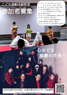 内容:6回の演劇ワークショップ後、 シャレオ西広場のイベントで公演 講師:劇団Tempa 定員:10人(多数の場合抽選) 参加費:無料 対象:小学3年生~中学3年生 ※すべての日程に参加可能な人 持参物:筆記用具、飲み物、上履き 申込:12月27日(土)迄に電話またはLINE |