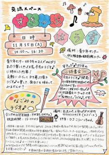 場所;青少年センター中2階自販機コーナー 時間;14:00-16:30 準備(13:00-14:00)、片付け(16:30-17:00)の時間は危ないので利用できません(ただし自販機の利用はOK) ○読書会・オススメ本紹介コーナー 時間;14:00-15:00(読書会)、14:00-16:00(オススメ本紹介コーナー) ※読書会は不定期開催です。また、オススメ本コーナーは読書会を開催しない日も設置しています。なお、1階ロビーにはオススメ本の常設展示コーナーがあります。 ○なごみのラジオ♪ ミニFMラジオ生放送(場所;すきっぷ♪はうす内特設サテライトスタジオ) 時間;15:00~16:00 内容;「今日のなごみ曲」、「今日のすきっぷ♪はうす紹介」「センターイベント・サークル情報/センター近隣のイベント情報」「なごみあれこれコーナー」「ウクレレミニミニLive♪」 ラジオをBGMに聴きながらくつろぎにお越しくださいね♪ ※青少年センター館内に設置のラジオでもお楽しみいただけます。 ○ワークショップ 時間;14:00-15:00 内容;小物作り等をお子さんから大人まで楽しく体験できます。※不定期開催です。 |